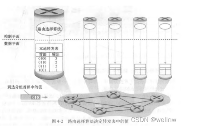 使用图4-2的方法进行描述就是将网络抽象的划分为数据层面(或者转发层面)和控制层面。