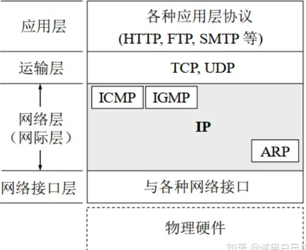 下图画出了这三个协议和网际协议 IP 的关系。在这一层中, ARP 画在最下面,因为 IP 经常要使用这个协议。 ICMP 和 IGMP 画在这一层的上部,因为它们要使用 IP 协议。这三个协议将在后面陆续介绍。由于网际协议 IP 是用来使互连起来的许多计算机网络能够进行通信的,因此 TCP/IP体系中的网络层常常被称为网际层(internet layer),或 IP 层。使用“网际层”这个名词的好处是强调。