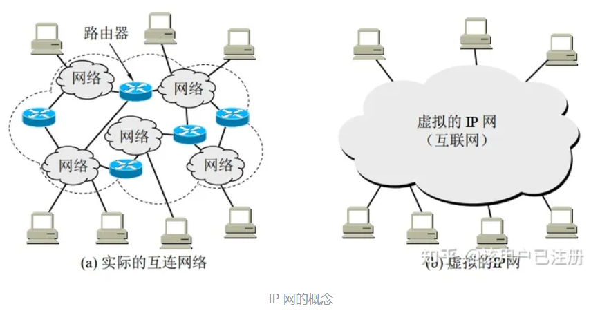 所谓虚拟互连网络也就是逻辑互连网络,它的意思就是互连起来的各种物理网络的异构性本来是客观存在的,但是我们利用 IP 协议就可以使这些性能各异的网络在网络层上看起来好像是一个统一的网络。这种使用 IP 协议的虚拟互连网络可简称为 IP 网(IP 网是虚拟的,但平常不必每次都强调“虚拟”二字)。