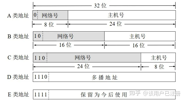 - E 类地址(前 4 位是 1111)保留为以后用。