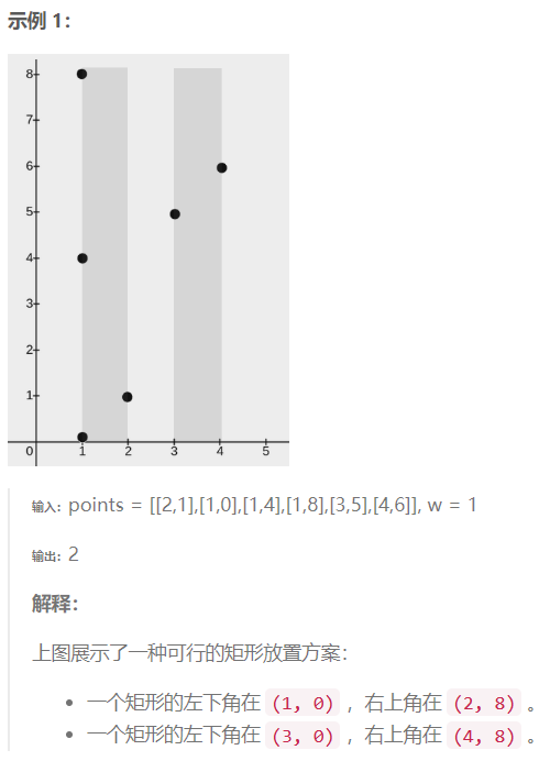 给你一个二维整数数组 point ,其中 points[i] = [xi, yi] 表示二维平面内的一个点。同时给你一个整数 w 。你需要用矩形 覆盖所有 点。