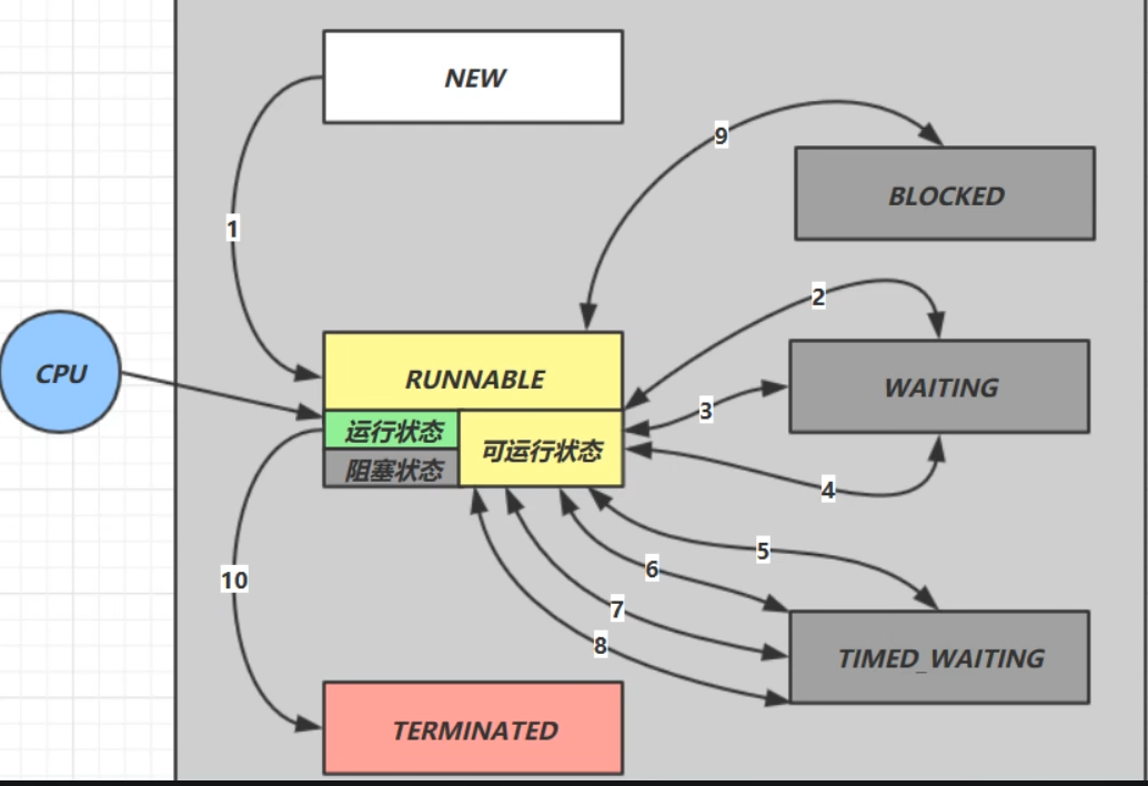 - 【可运行的状态】(就绪状态)指的是该线程已经被创建了(与操作系统相互关联),还可以由CPU调度执行,暂时没有获得CPU的时间片