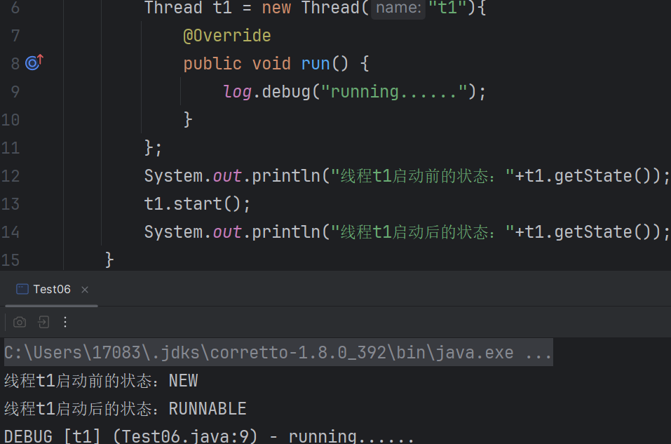 //首先打印RUNNABLE的原因是:主线程的代码先运行,先运行以后t1线程再运行,