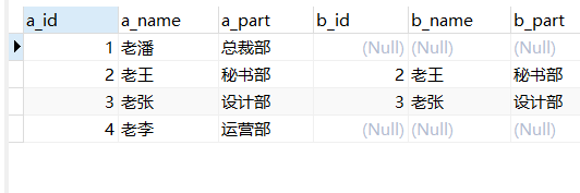 左(外)连接,左表(a_table)的记录将会全部表示出来,而右表(b_table)只会显示符合搜索条件的记录。右表记录不足的地方均为null。