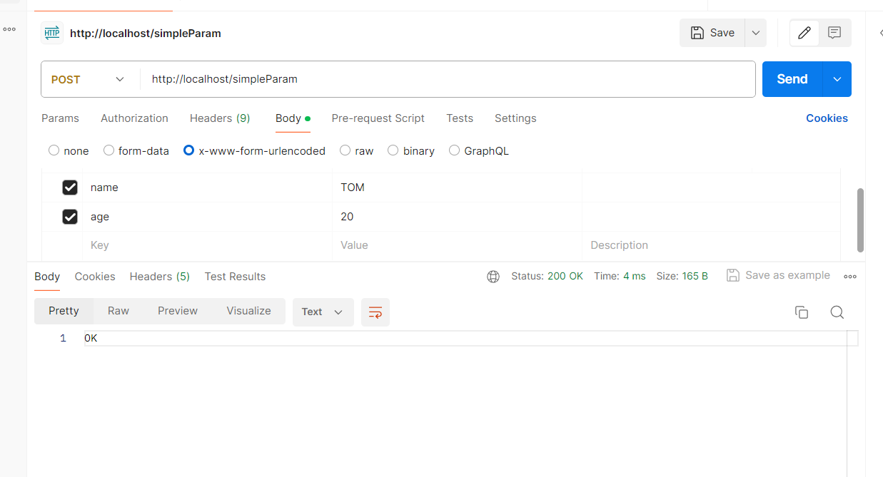 请求路径(post方式)URL地址:http://localhost/simpleParam,在请求体中填入name,age